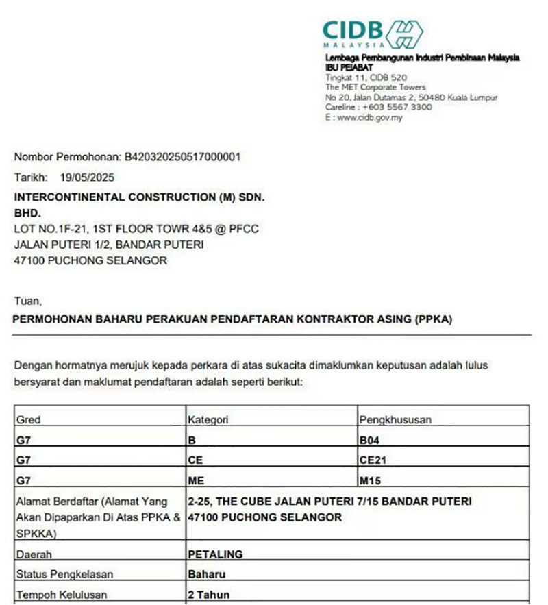 近日,經(jīng)馬來西亞建筑工業(yè)發(fā)展局(CIDB)批準(zhǔn),合景建設(shè)集團(tuán)有限公司全資子公司洲際建設(shè)(馬來西亞)有限公司取得馬來西亞最高等級G7承包商資質(zhì),包括土木工程(CE21)、土建工程(B04)、機(jī)電工程(M15)以及各種機(jī)械工程等多項(xiàng)內(nèi)容。這是合景建設(shè)在馬來西亞建筑資質(zhì)領(lǐng)域的重大突破,意味著公司在智慧建筑領(lǐng)域的技術(shù)實(shí)力、屬地化服務(wù)能力及行業(yè)影響力獲官方權(quán)威認(rèn)可。