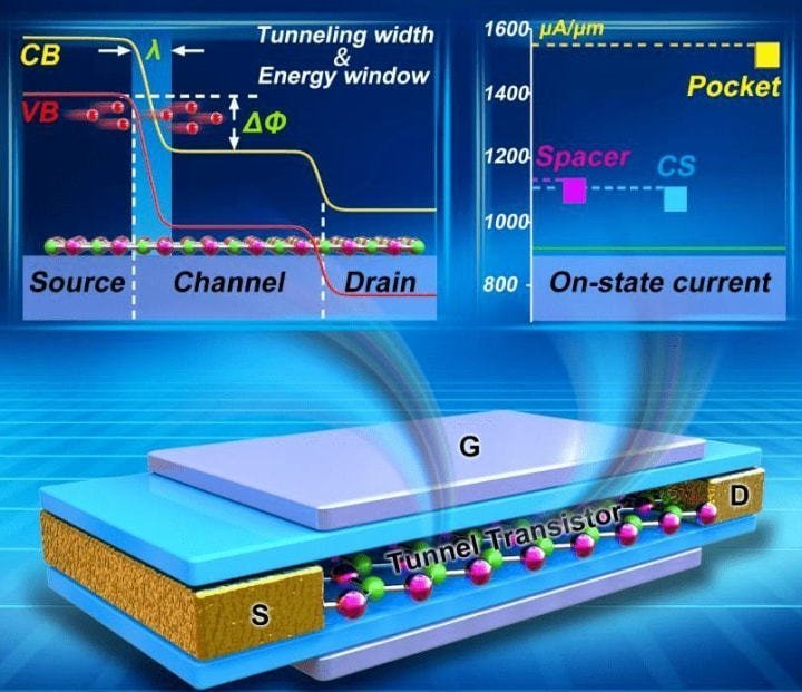 隧道場(chǎng)效應(yīng)晶體管(TFET-Tunnel Field Effect Transistor),和傳統(tǒng)MOSFET晶體管原理不同,在TFET中源極和漏極摻雜不同。它使用量子力學(xué)隧道效應(yīng),柵極和源極之間的電壓決定了電荷載流子是否可以“隧穿”通過源極和漏極之間的能量勢(shì)壘,以及電流是否可能流動(dòng)。