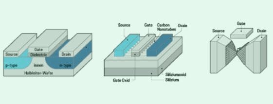 由于量子力學(xué)隧道效應(yīng),電子可以穿越絕緣體,這將使元件功能失效。人們開始尋找一種新型晶體管,可以進(jìn)一步提高未來集成電路的性能,作為傳統(tǒng)晶體管的替代品。目前有很多研究,但還沒有領(lǐng)先者可以取代硅MOSFET。研究人員列出了一系列MOSFET替代品,包括隧道場(chǎng)效應(yīng)晶體管TFET,碳納米管場(chǎng)效應(yīng)晶體管,單原子晶體管。